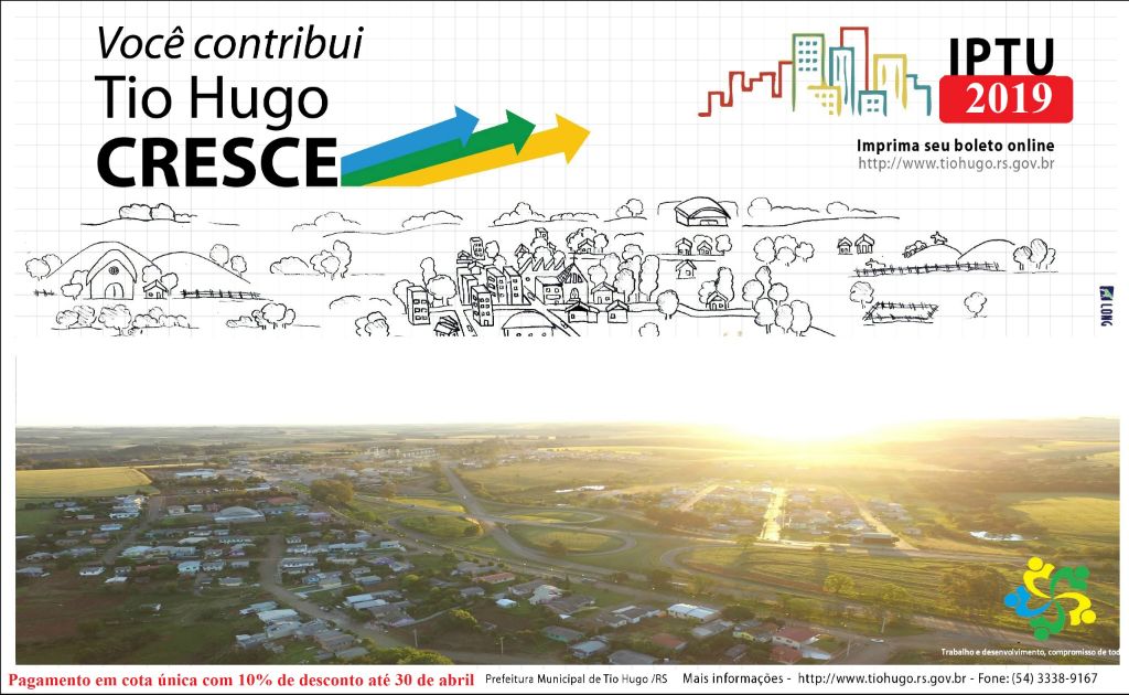 Os contribuintes de Tio Hugo que anteciparem o pagamento do IPTU/2019 em cota única até 30 de abril de 2019 terão direito a 10% de desconto. Após o término deste prazo, o imposto predial e territorial urbano será automaticamente parcelado em 3 parcelas iguais, sem desconto, com vencimento nas seguintes datas: