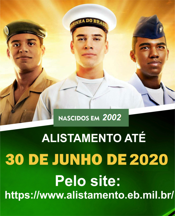 Os jovens de Tio Hugo que completam 18 anos em 2020, deverão se alistar no Serviço Militar até o dia 30 de junho. O Éxercito Brasileiro disponibiliza uma plataforma online para alistamento através do site https://www.alistamento.eb.mil.br/, ou pelo aplicativo do Exército disponível para Android e IOS.