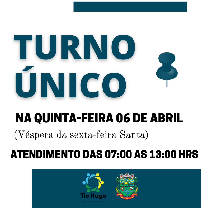 O Poder Executivo Municipal de Tio Hugo informa que adotará turno único de expediente na próxima quinta-feira dia 06 de abril, véspera do feriado da Paixão de Cristo (Sexta-feira Santa).