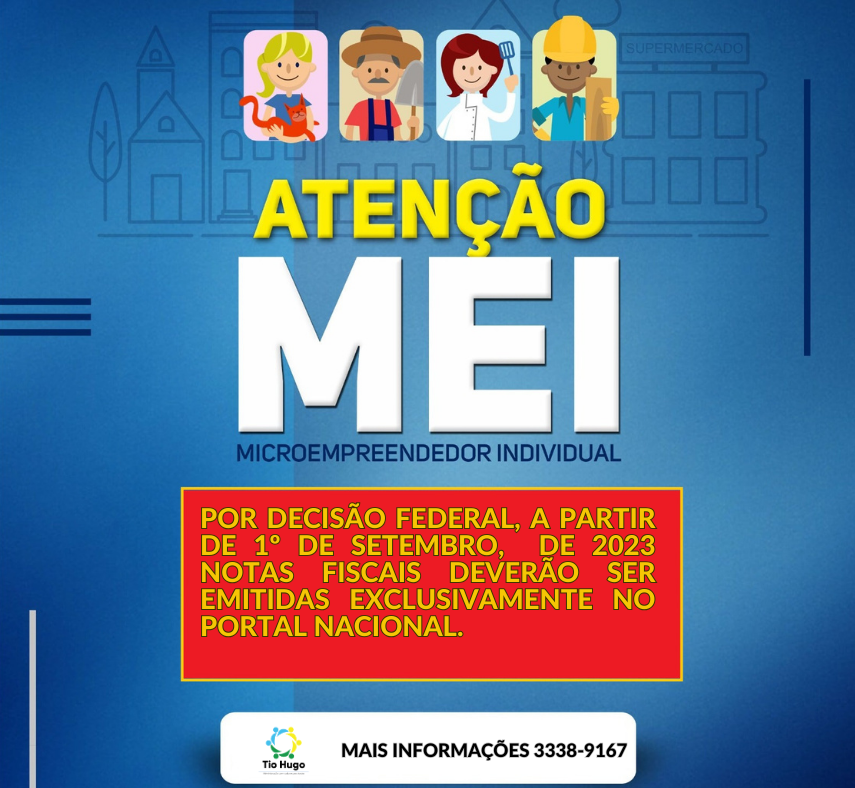 A Secretaria Municipal de Administração e o setor tributário de Tio Hugo informam que a partir da próxima sexta-feira, 1º de setembro, os Microempreendedores Individuais (MEIs) deverão emitir suas notas fiscais eletrônicas exclusivamente pelo Portal Nacional. A partir desta data, não será mais possível, para os MEIs, utilizar o sistema para emissão de notas disponível no site do Município. É importante enfatizar que esta medida é uma determinação federal, conforme a Resolução CGSN nº 172/2023 , que visa a padronização nacional da emissão de documentos fiscais e de serviços do MEI, bem como a dispensa de emissão de outro documento fiscal municipal relativo ao Imposto Sobre Serviço (ISS).