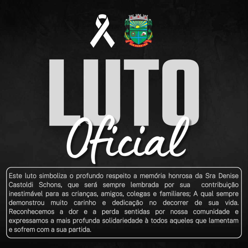 O Poder Executivo Municipal de Tio Hugo manifesta novamente o mais profundo pesar pelo falecimento da servidora pública municipal DENISE CASTOLDI SCHONS, ocorrido no dia 19 de maio de 2024.