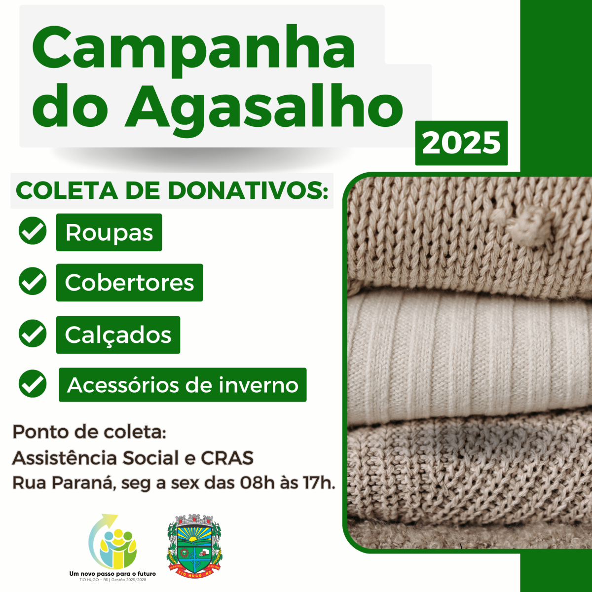 A secretaria de Assistência Social e o CRAS de Tio Hugo, estão recebendo roupas, casacos, calçados, cobertores, ou qualquer outro acessório, que pode ser usado por alguém neste inverno.